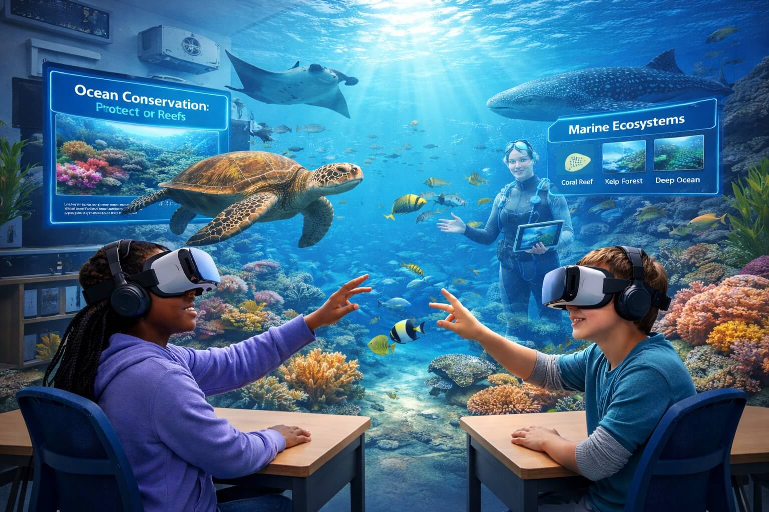 Immersive virtual reality experiences designed to help students explore the ocean, learn about ecosystems, and understand the importance of conservation in a calm and engaging environment.